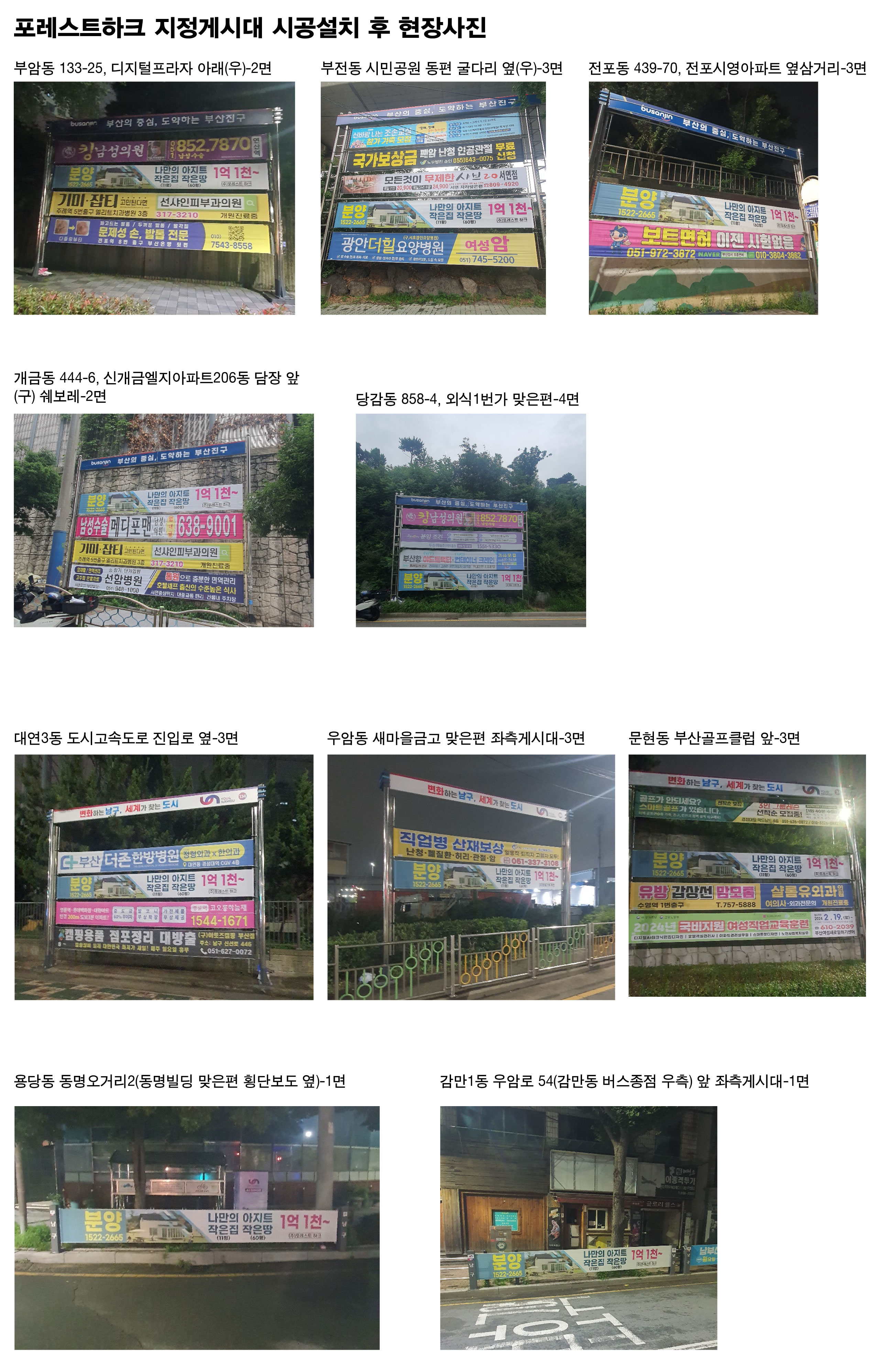 포레스트하크 분양사무실에서는 요번에, 부산내에 있는 지정게시대 10곳을 추려, 제작 부착까지 시공요청을 해주셨습니다